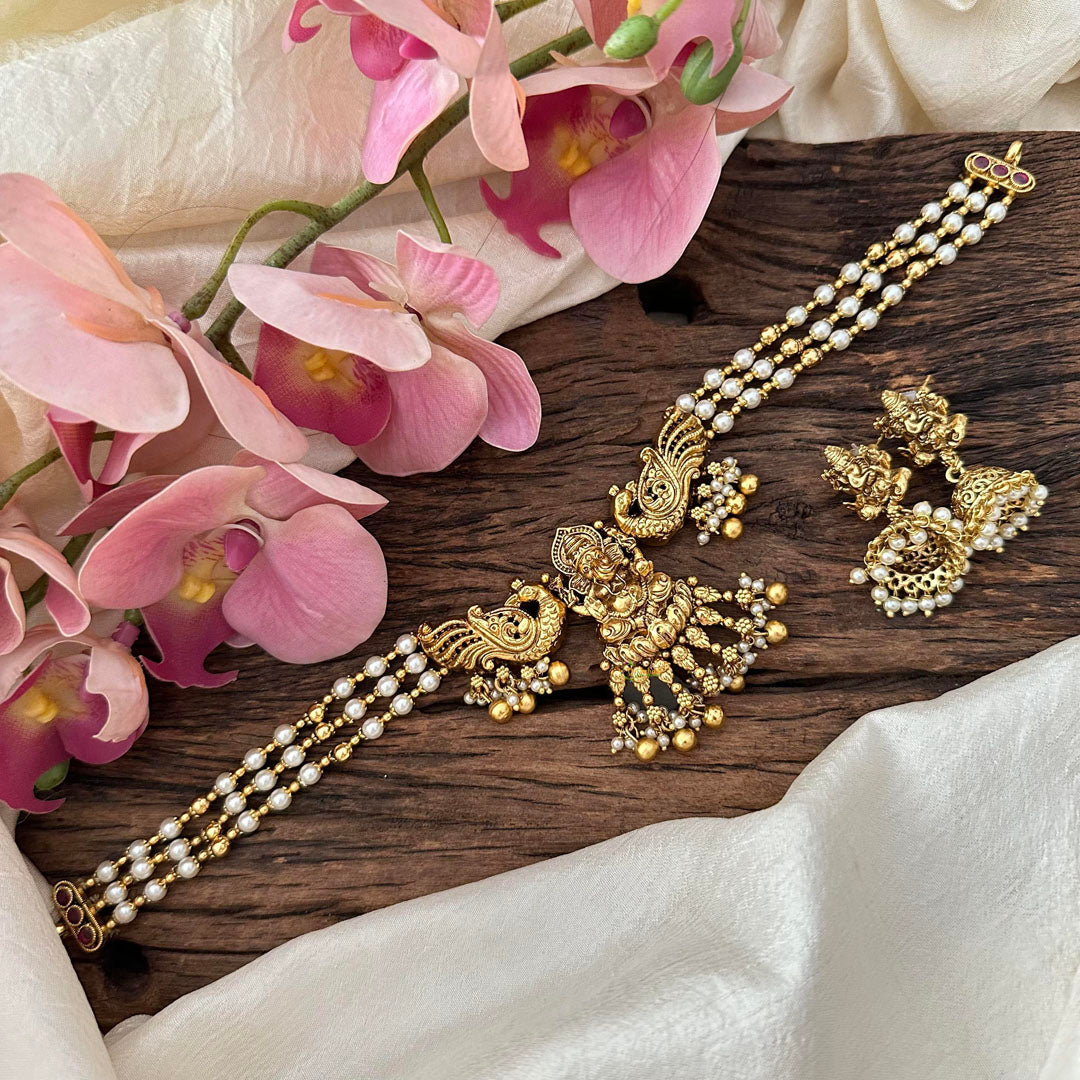 Indulge in the luxurious elegance of our 3 Layer Ganpati Pendant High Neck Choker. Adorned with delicate pearls and golden beads, this piece exudes sophistication and grace. Featuring a stunning Ganpati pendant, it adds an exclusive touch to any outfit. Elevate your style with this must-have accessory. Comes with matching stone ear hangings.