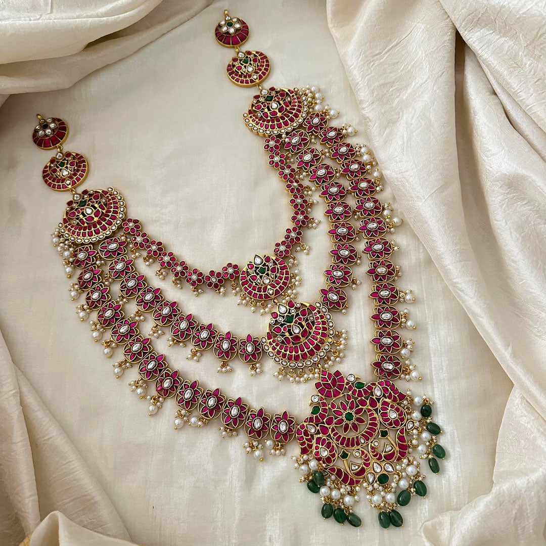 Make material :3 Layer Statement Kundan Jadau Neckpiece - is made of Kundan Precious stones, temple make, artificial pearls, Copper and brass alloy.