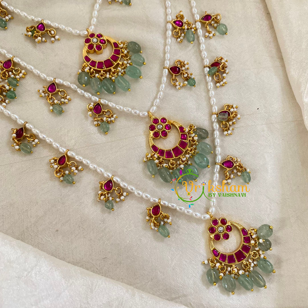 3 Layered Jadau Kundan Pearl Neckpiece-  pendants- Jadau Kundan work hangings. Pearl and Green Bead Finish. Color, shades, texture displayed may slightly vary from the actual product due to photography...