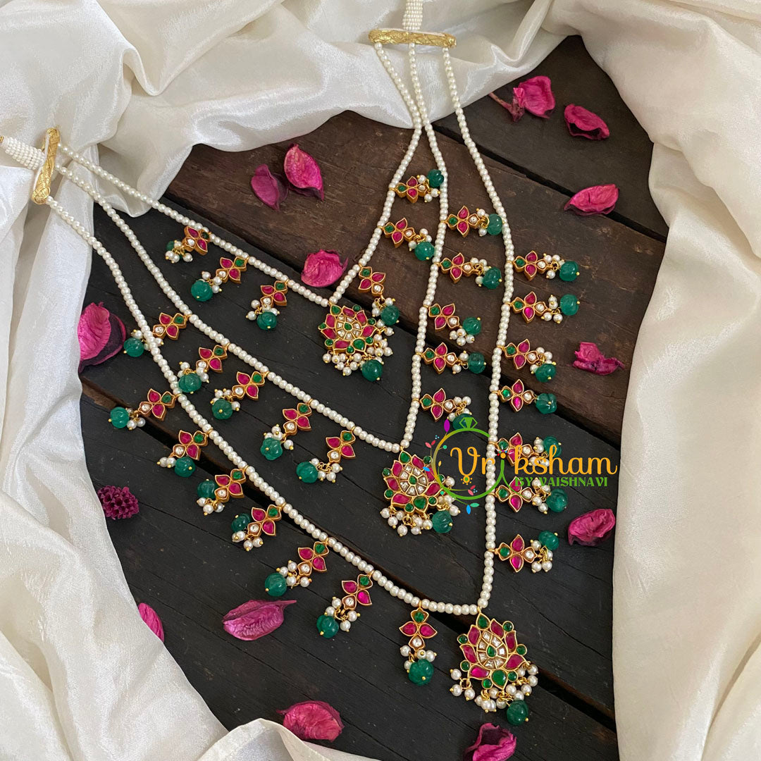 3 Layered Lotus Pendant Pearl Neckpiece- Jadau Kundan work hangings. Pearl and Green Bead Finish.