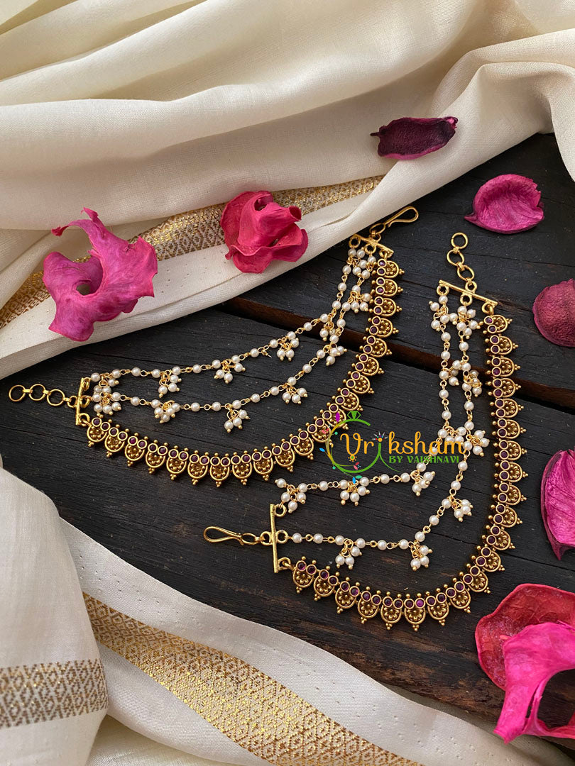Red AD Stone 3 Layered maatil-Ear Chain- floral pattern stone maatil/maatal ear chain.