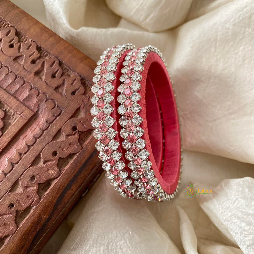 3 Line Stone Silk Thread Kundan Bangle -Pink White- kundan stone (glossy stone) festive bangles , Comes as 2 bangles only.