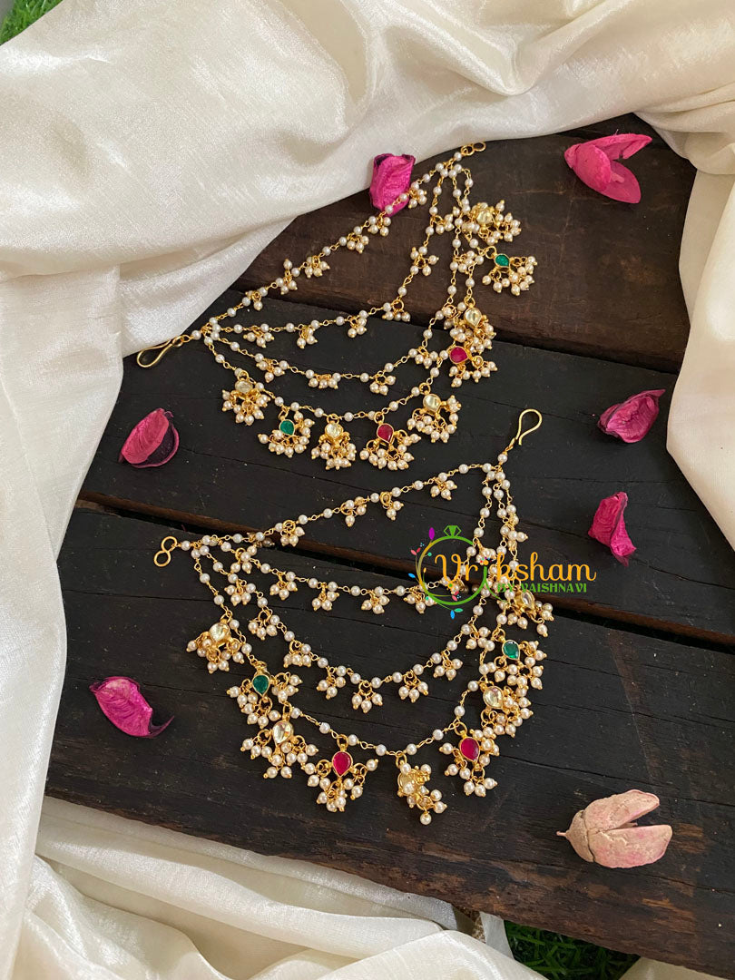 4 Layered Pearl maatil /Ear Chain-AD Stone red green and white studded in bottom row of the maatil- quality maatal with cluster pearls.