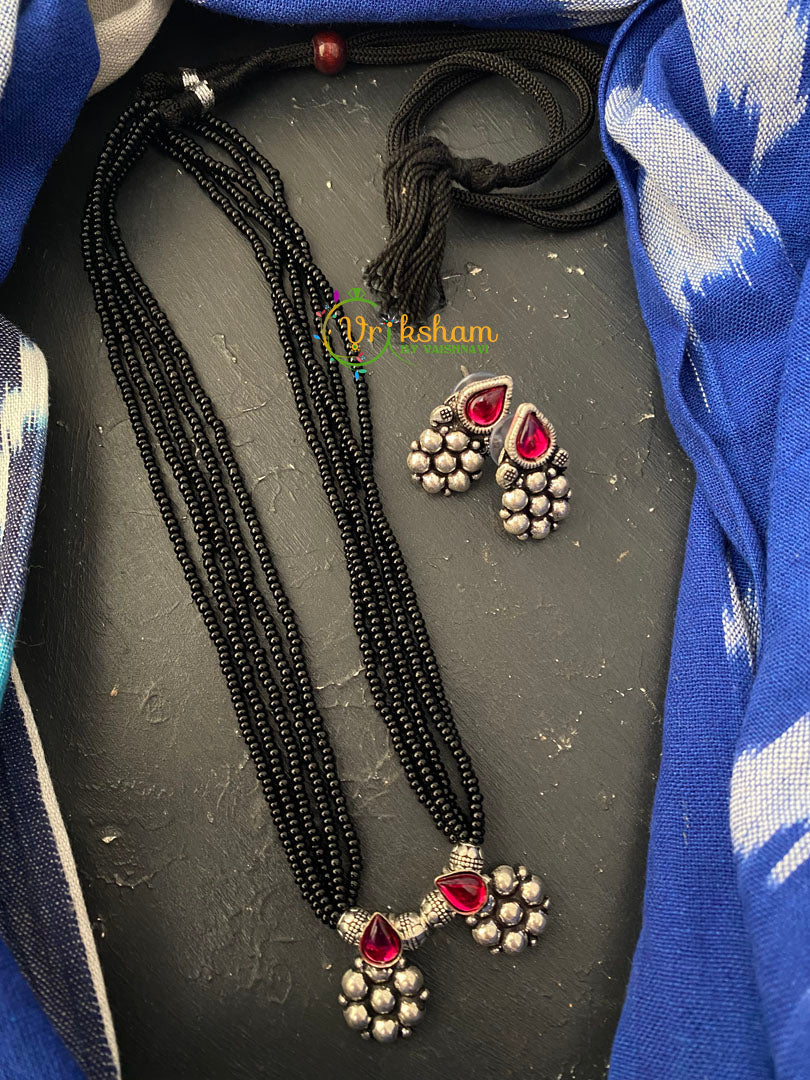 Make material: Cluster Pendants- cluster like design Black Bead Short Chain - oxidized silver alloy, red stones, black rope.
