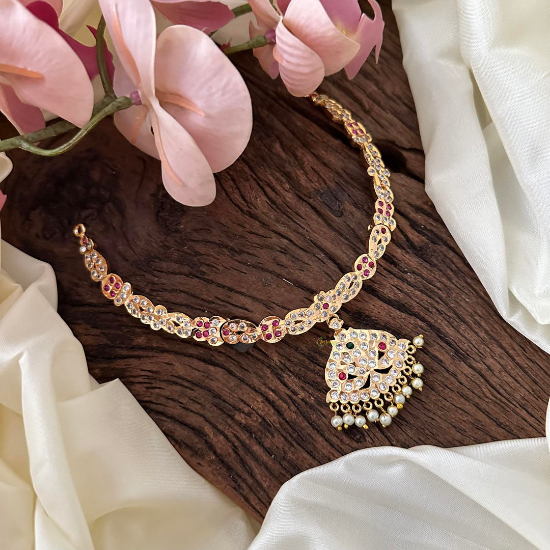Experience the elegance and glamour of the 90s with our AD Stone Short Neckpiece. The charming combination of red, green, and pearl stones exudes a unique vintage appeal. Elevate any outfit with this luxurious and exclusive statement piece.