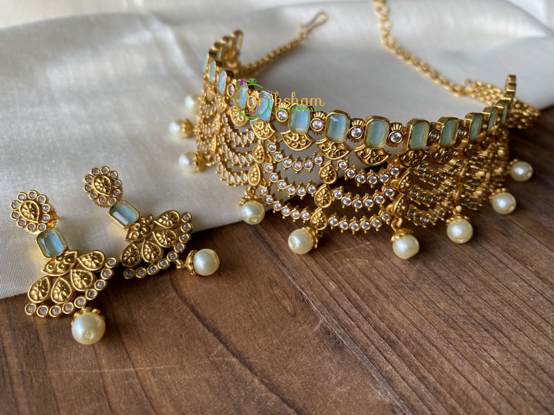 AD stone and Blue Stone Choker-Designer Choker -Layers of white stone with pearl ends, comes with matching danglers.
