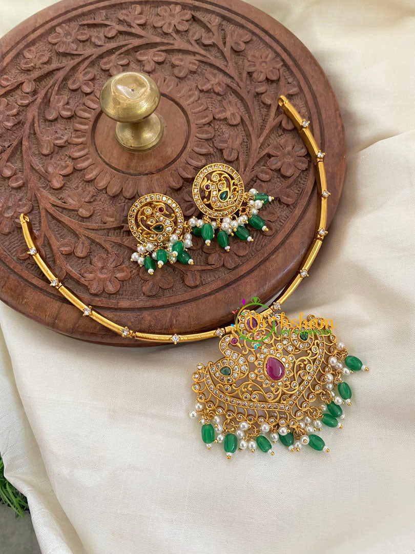 AD Stone Annam Pendant Hasli-Green bead finish- white stones on sides ;premium quality AD Stone studded pendant hasli short neckpiece, comes with matching earrings.