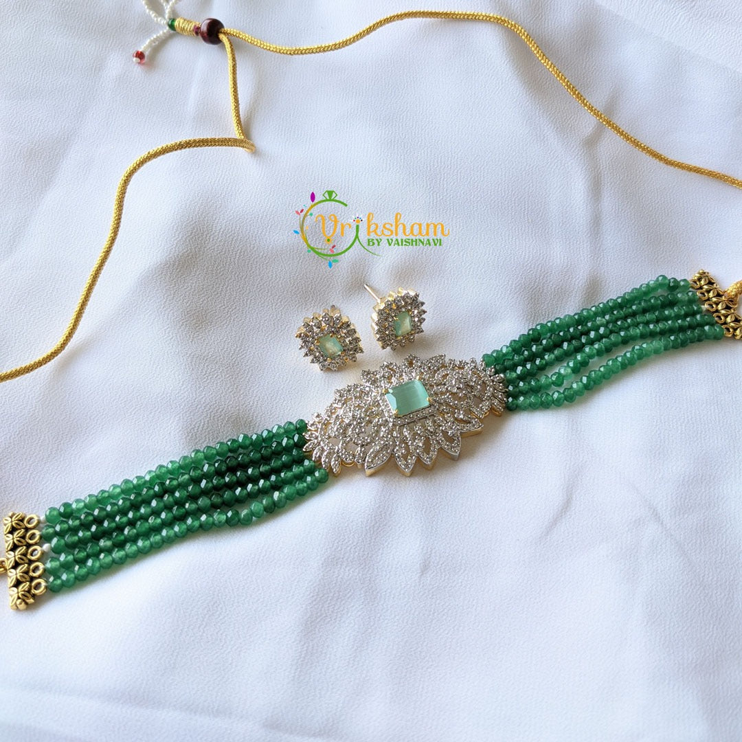 AD Stone Beaded High Neck Choker -light Green five layers beaded and light green centre stone set pendant high neck choker, comes with matching studs.