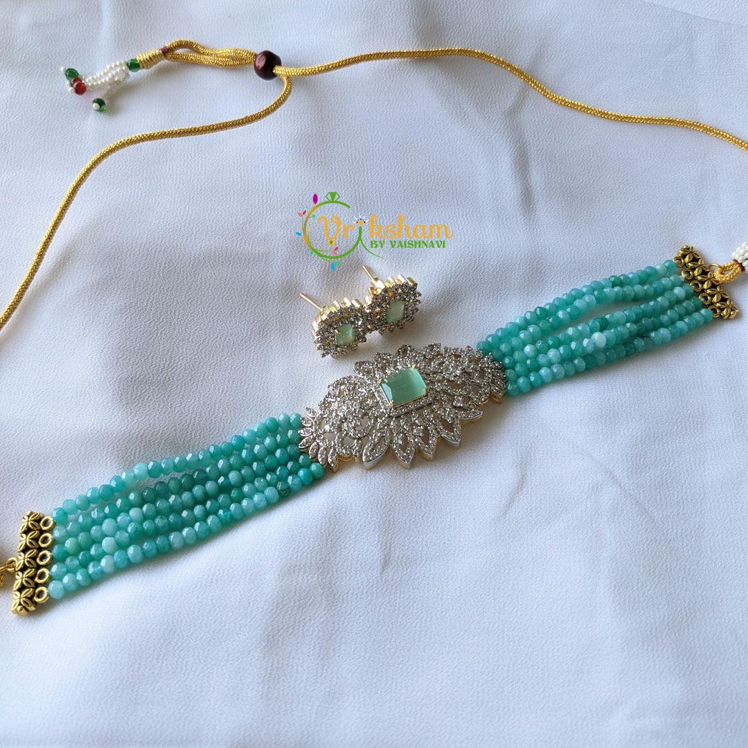 AD Stone Beaded High Neck Choker -Teal Blue five layers beaded and sea green centre stone set pendant high neck choker, comes with matching studs.