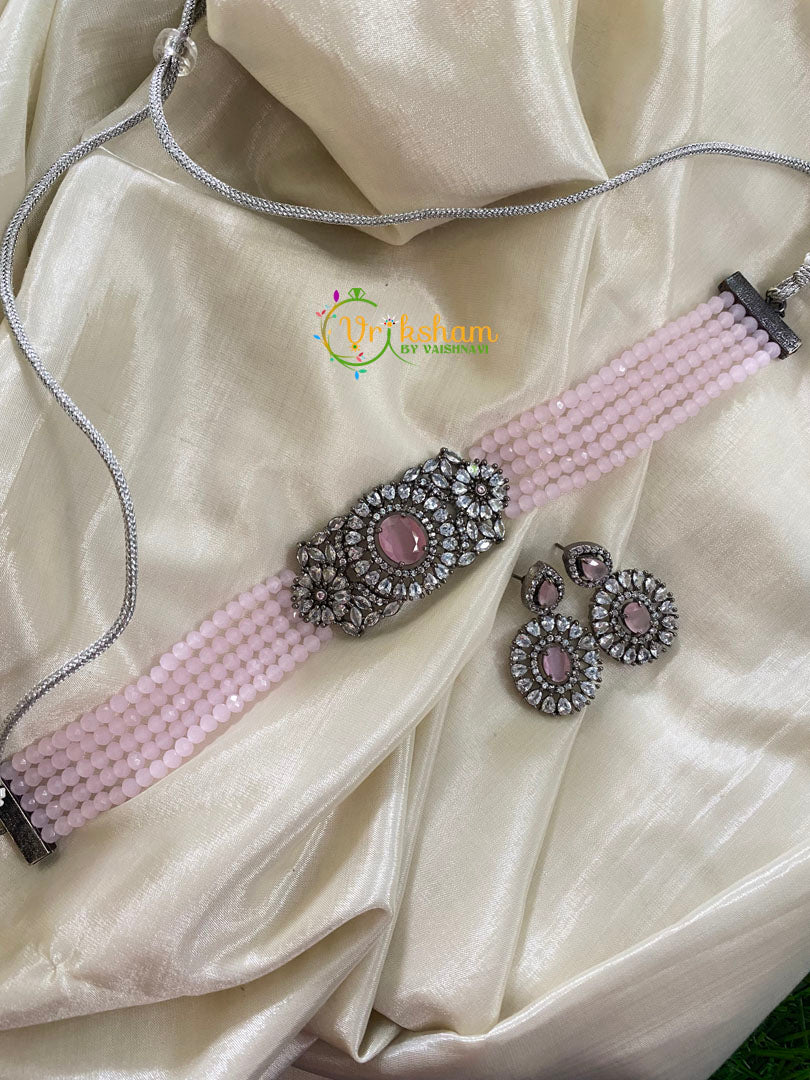 AD Stone Beaded High Neck Choker -Rose five layers beaded and rose centre stone set pendant high neck choker, comes with matching studs.