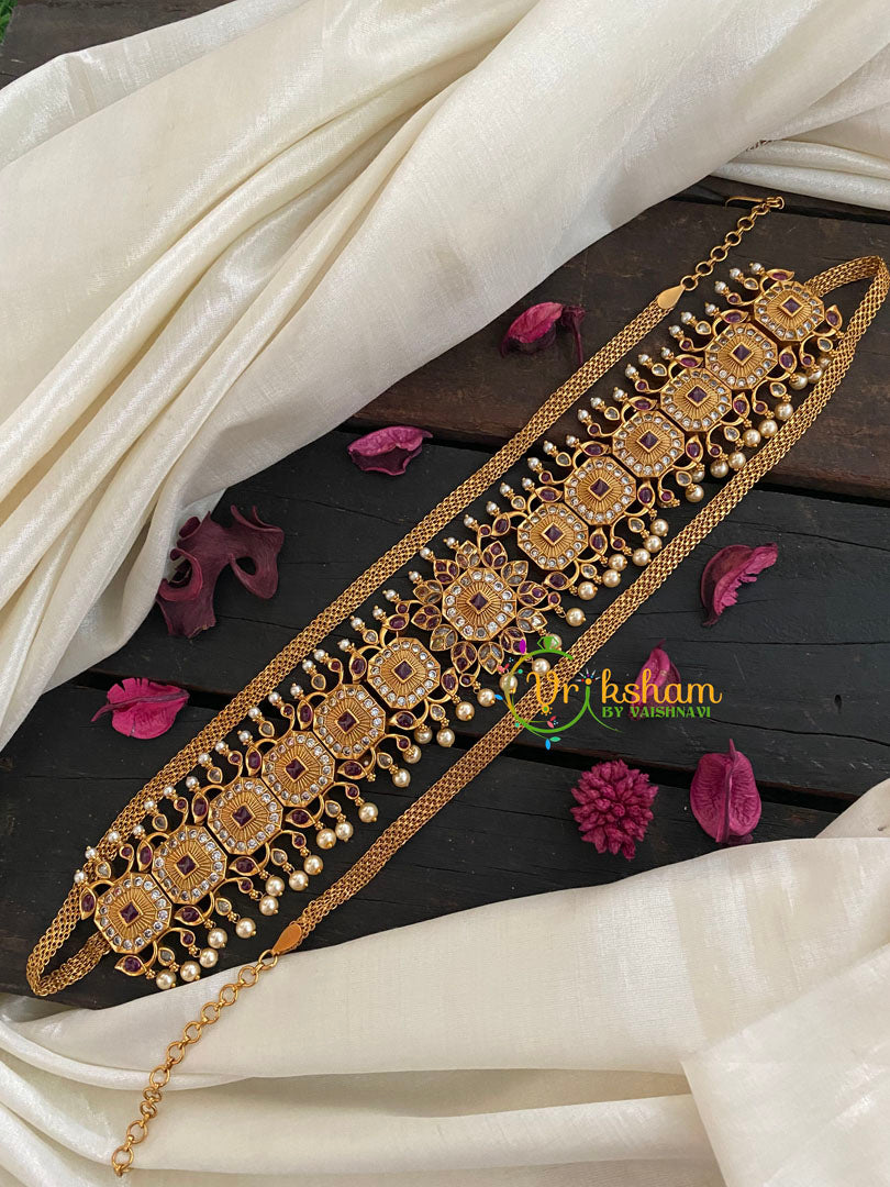 Gold look alike AD Stone Bridal Hip Chain-Square –Red Stone studded geometrical Gold tone hip chain with adjustable back chain. Pearl Finish.