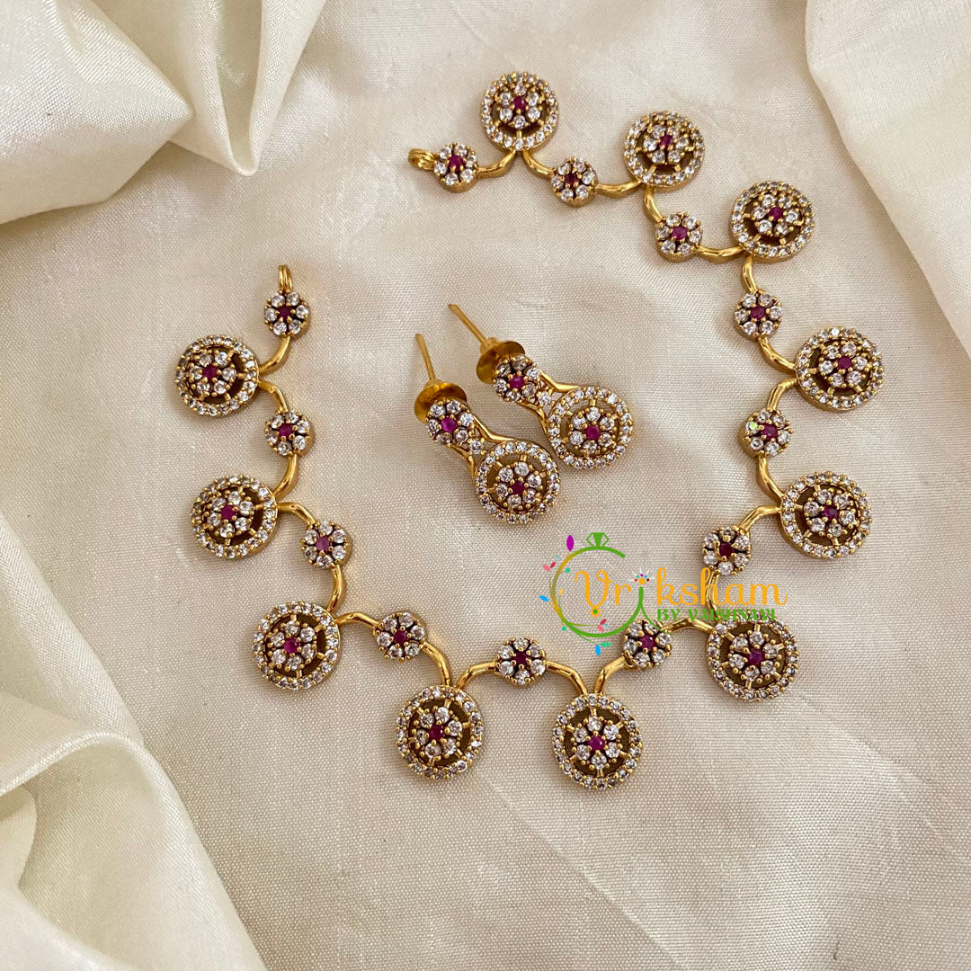 AD Stone Chakra Choker Short Neckpiece -Red and white AD stone flower in side a patterned choker short neckpiece with earrings.