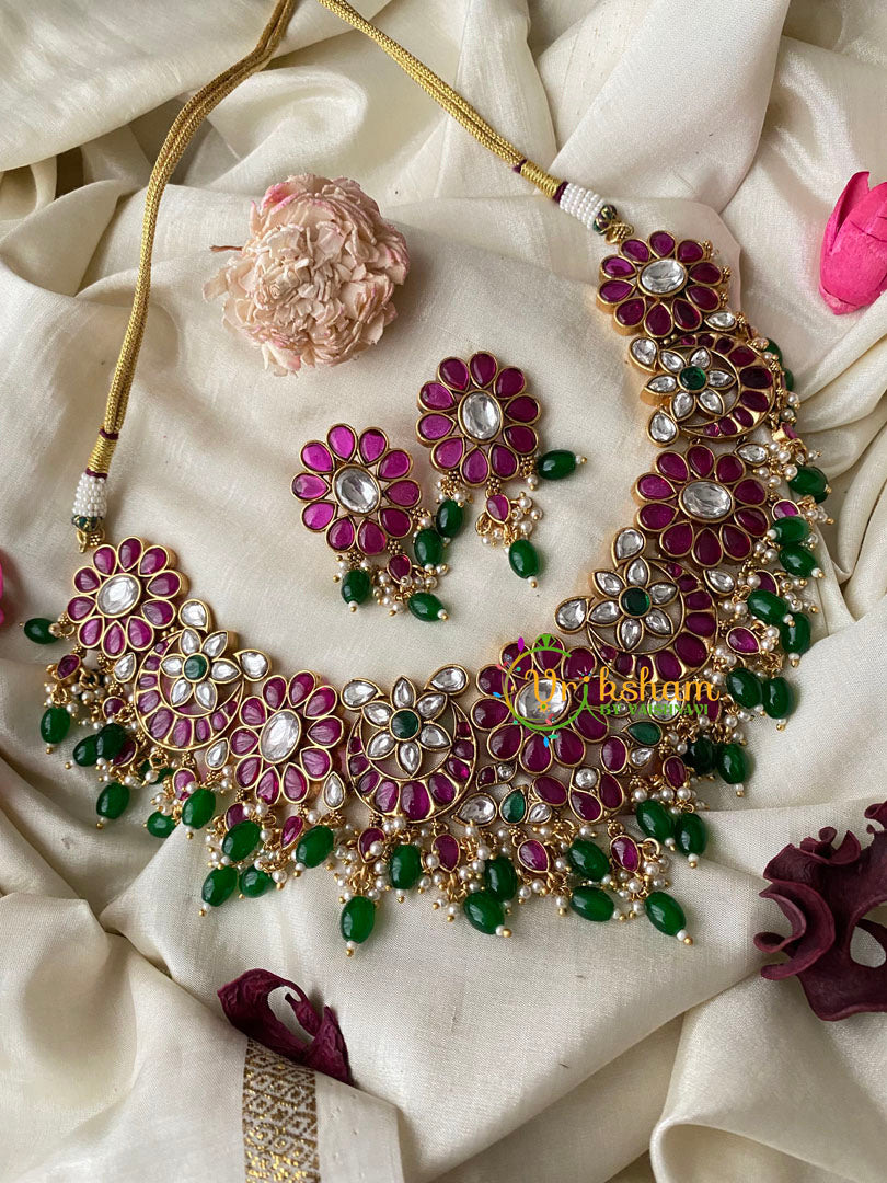 AD Stone Chandbali Choker Short Neckpiece – Red and White half moon style choker with centre green stone, comes with matching earrings. Green bead and pearl finish.