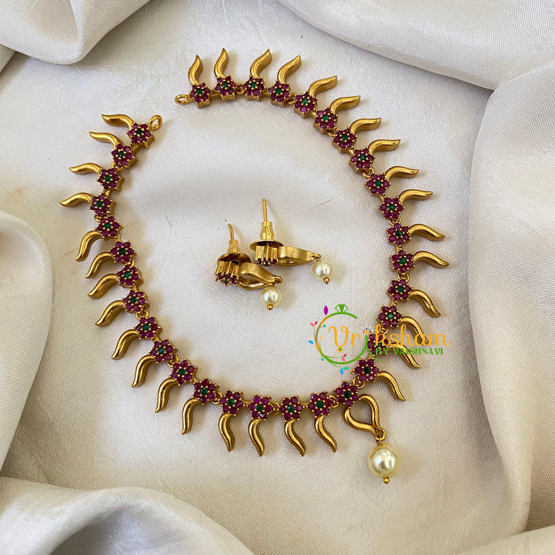Elegant Premium AD Stone Choker Short Neckpiece-Green Red AD stone mullai patterned choker with earrings.