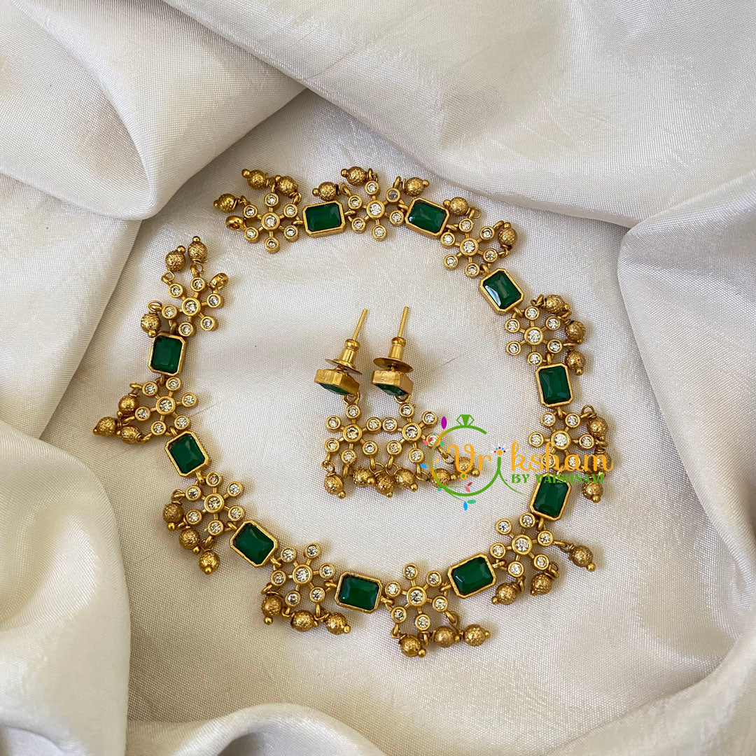 Elegant Premium AD Stone Choker Short Neckpiece-Green white AD stone flower and square patterned choker with earrings.