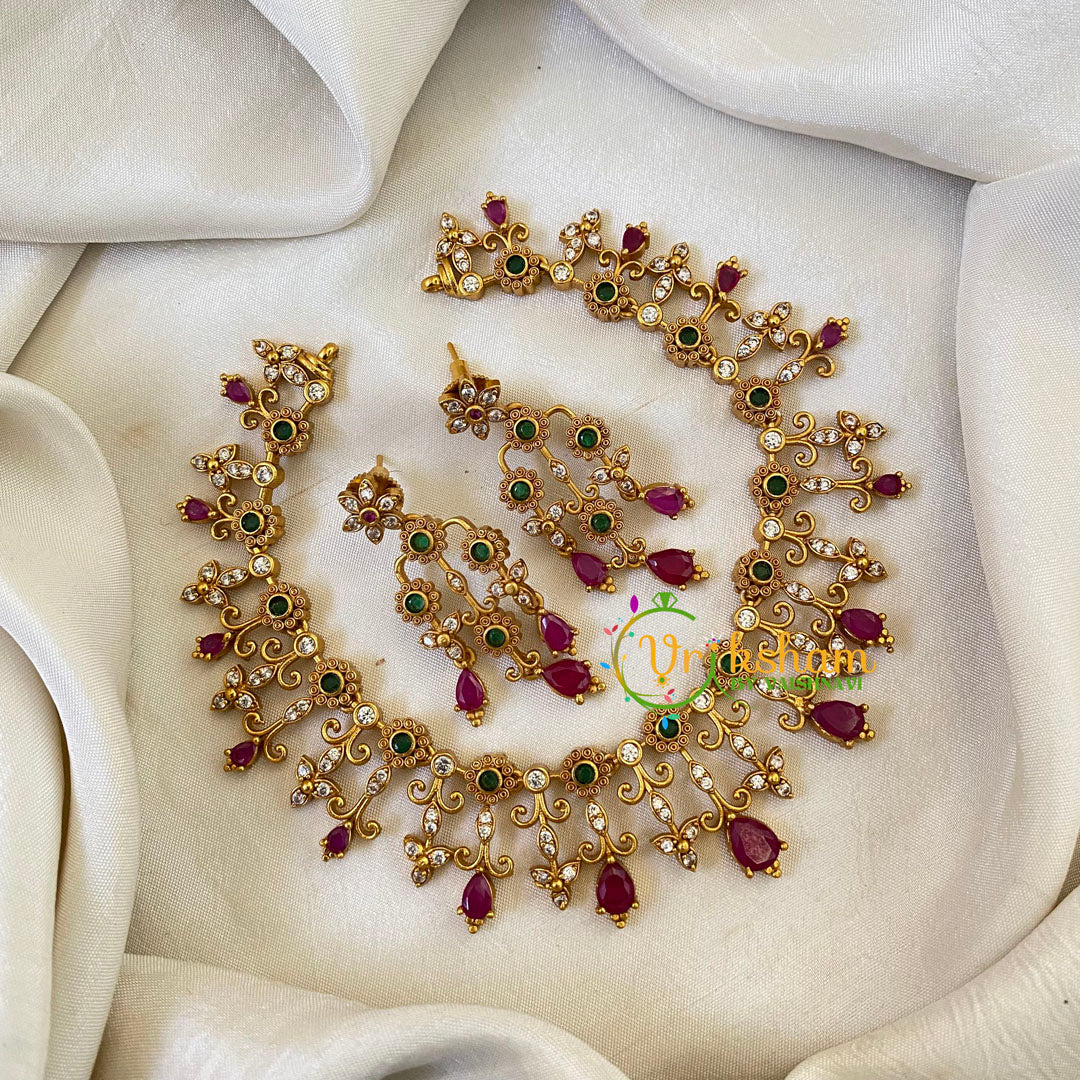 Premium AD Stone Choker Short Neckpiece - Premium quality short neckpiece - Red White and Green stones, comes with similar matching ear hangings.