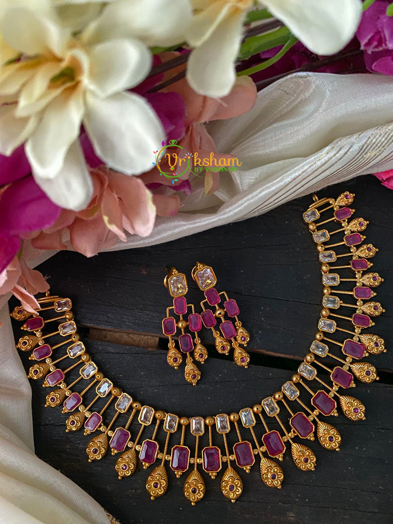 Premium AD Stone Fancy Short Neckpiece -Red stone set two layered geometrical patterned choker with earrings.