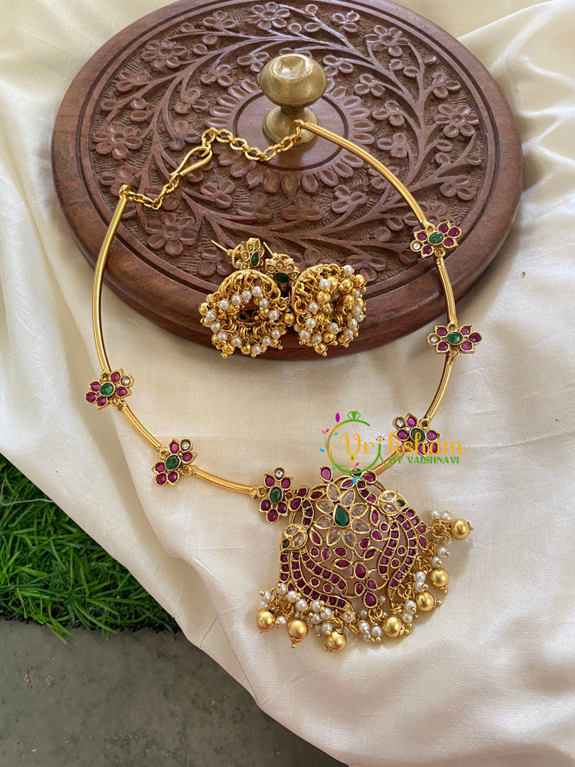 AD Stone Floral Pendant Hasli-Gold bead finish- flowers on sides ;premium quality AD Stone studded pendant hasli short neckpiece, comes with matching earrings.