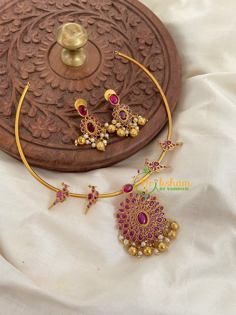 AD Stone Floral Pendant Hasli-Red-Gold Bead finish parrot side pendants premium quality AD Stone studded pendant hasli short neckpiece, comes with matching earrings.