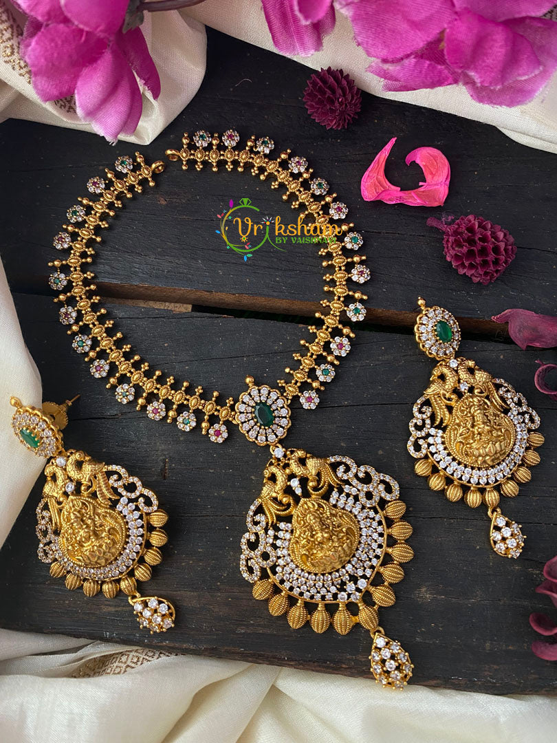 Premium AD Stone Floral Temple Neckpiece with flowers of red and green stone and lakshmi pendant and ear hangings.