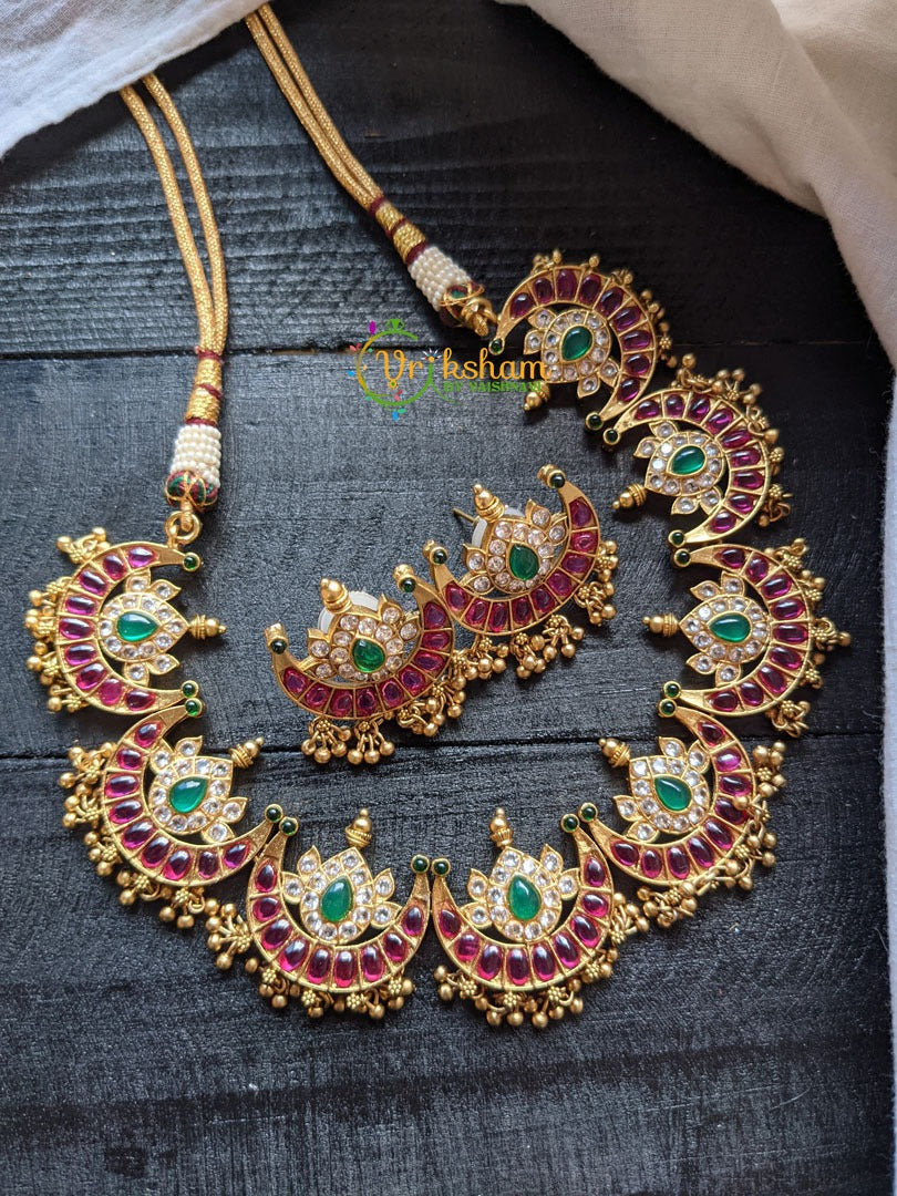 AD Stone Half Moon Choker - Red and White half moon style choker with centre green stone, comes with matching earrings.