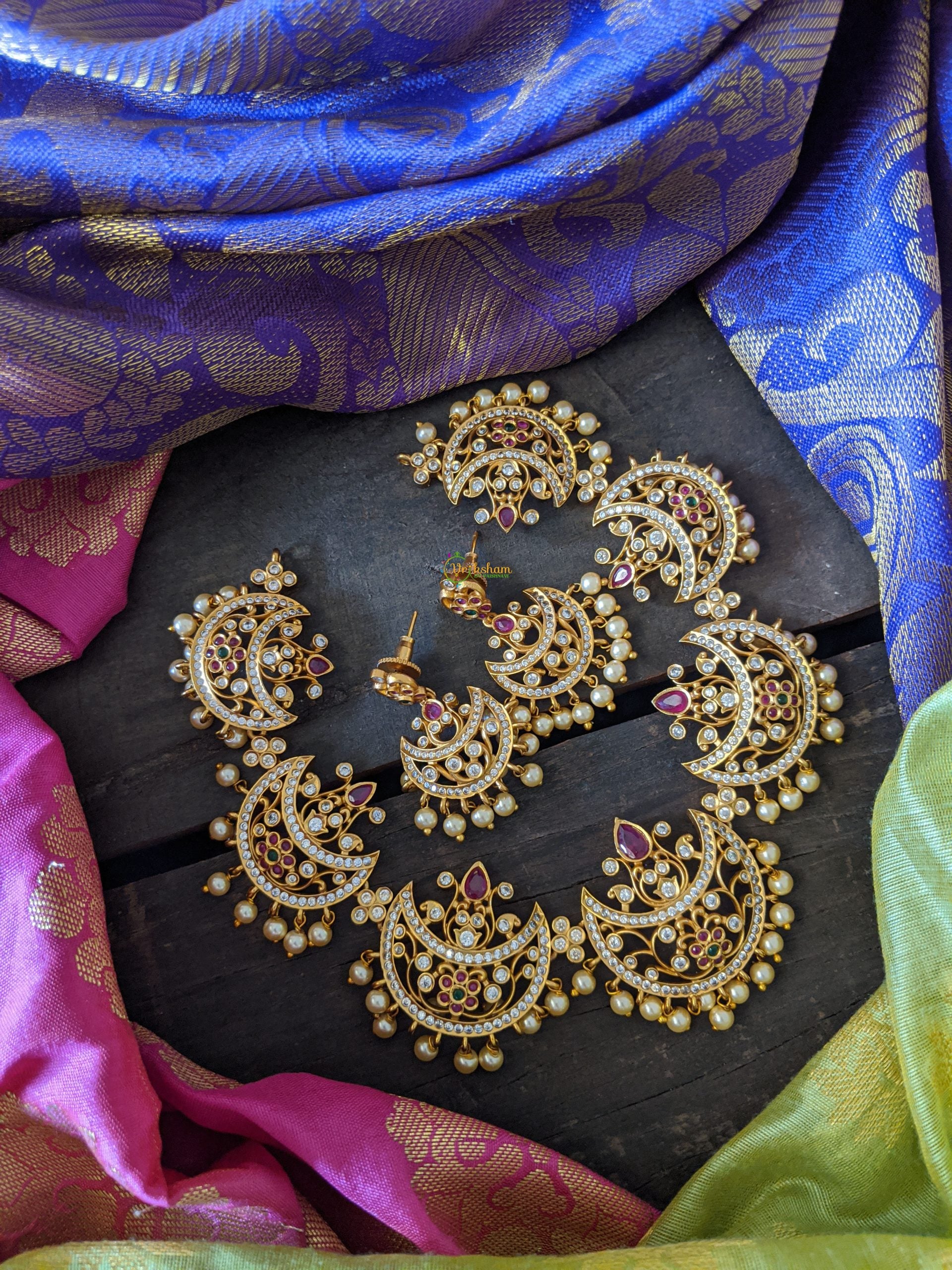 AD Stone Half Moon Neckpiece - White red and green AD stones, chandbali short neckpiece, comes with half moon ear hangings.