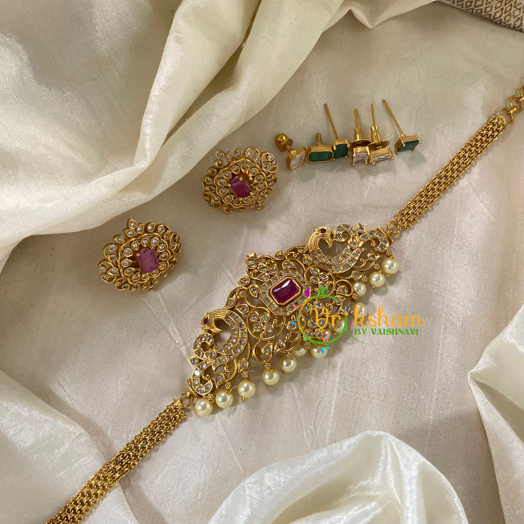 Interchangeable AD Stone High Neck Choker -Pink, Green and White stone interchangeable high neck choker, comes with pair of matching earrings.
