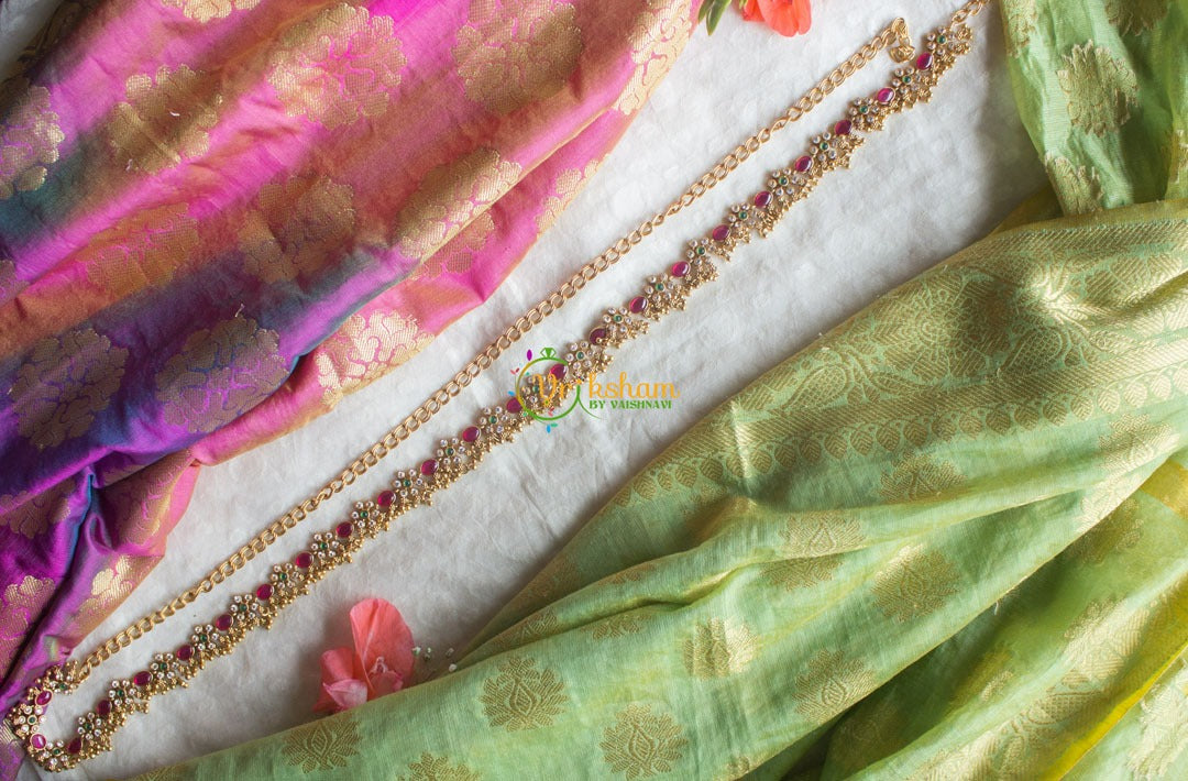 AD Stone Hipchain -Bridal Hipchain– Flower patterned predominantly green, white and pink ad stone and imitation stone with small golden beads hipchain.