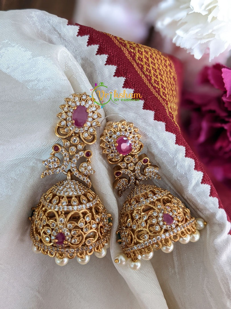 AD Stone Jhumkas – with centre pink stone– White green and pink AD stone jhumka.