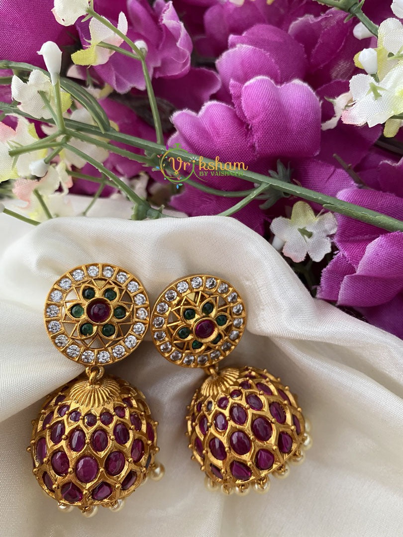 AD Stone Jhumkas Regular Size-White Red Green floral Stud with dome finish jhumkas. Smaller Size Jhumkas.