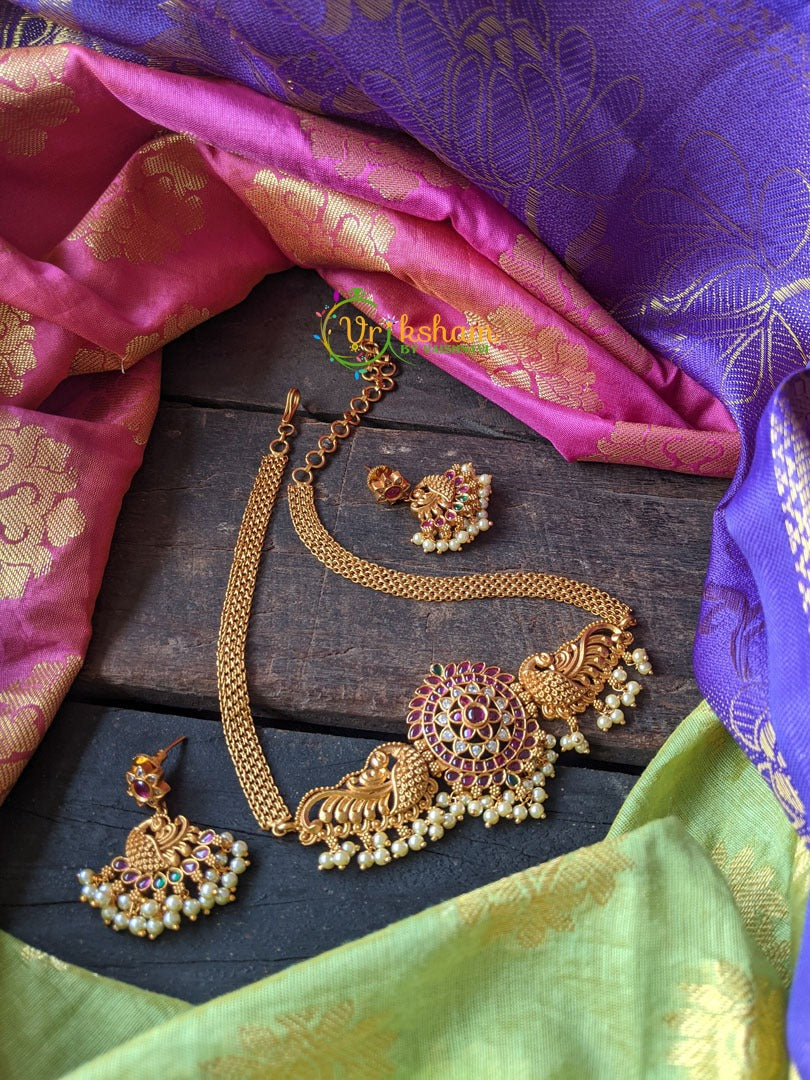 AD Stone Kemp High Neck Choker -Premium quality high neck choker with peacocks and guttapusalu pearl finish, comes with matching earrings.