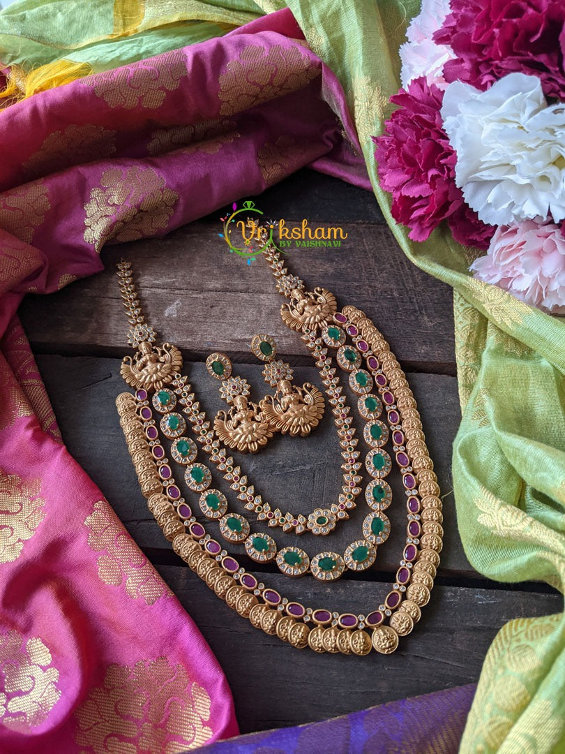 AD Stone Layered Lakshmi Coin and Lakshmi Mugappu Haram – red green and white Long neckpiece with lakshmi coins and mugappu, comes with matchinglakshmi danglers.