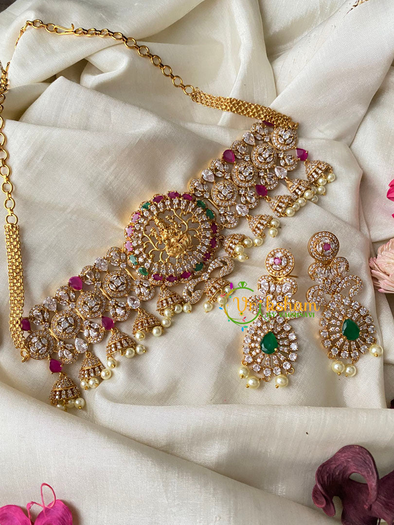 Premium AD Stone Lakshmi High Neck Choker-Red Green-with Goddess Lakshmi idol embedded throughout; matching ear hangings.