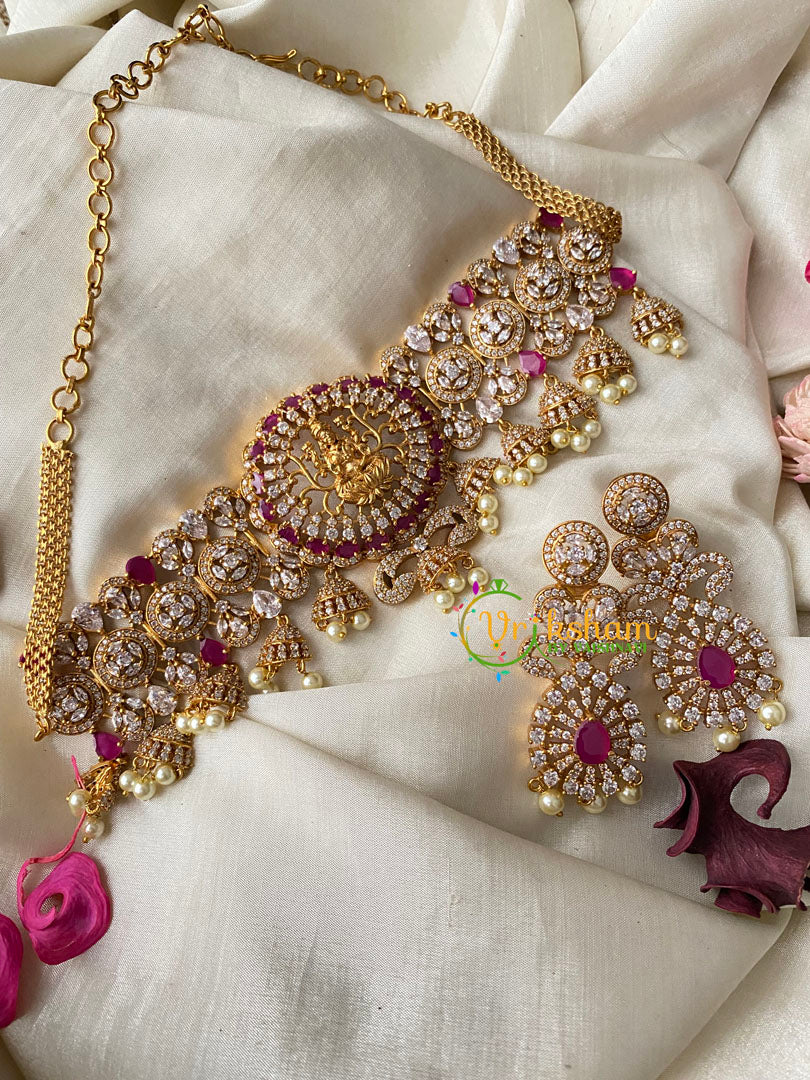 Premium AD Stone Lakshmi High Neck Choker-Red white ad stone studded -with Goddess Lakshmi idol embedded throughout; matching ear hangings.