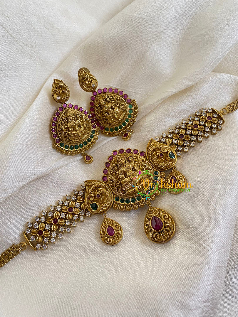 Premium AD Stone Lakshmi High Neck Choker-Red white and green ad stone studded -with Goddess Lakshmi idol embedded throughout; matching ear hangings.