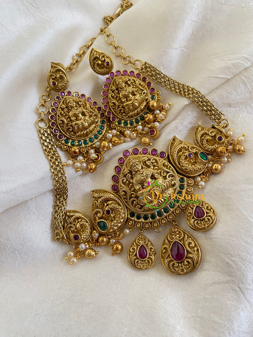 Premium AD Stone Lakshmi High Neck Choker-Red white and green ad stone studded -with Goddess Lakshmi idol embedded throughout; matching ear hangings.