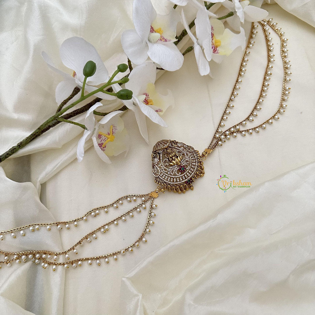 Indulge in the beauty and grace of our AD Stone Lakshmi Jada Billai with Pearl Maatil. Crafted with intricate details and adorned with dazzling stones, this piece exudes elegance and luxury. The Lakshmi motif symbolizes prosperity and adds a divine touch to any attire. Elevate your style with this exclusive piece.