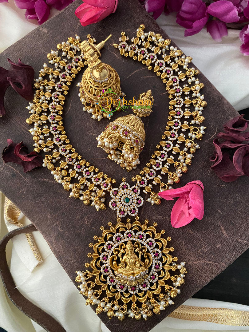 Premium AD Stone Lakshmi Pendant Short Neckpiece –White Pink and Green stone studded neckpiece with matching earrings; PEARL FINISH; comes with matching jhumkas.