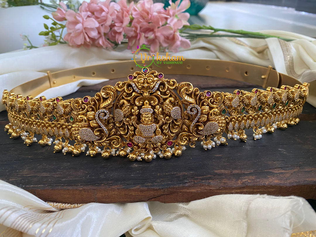 AD Stone Lakshmi Temple Hipbelt- with ad stone studded lakshmi idol, swans and floral pattern bridal temple hipblet.