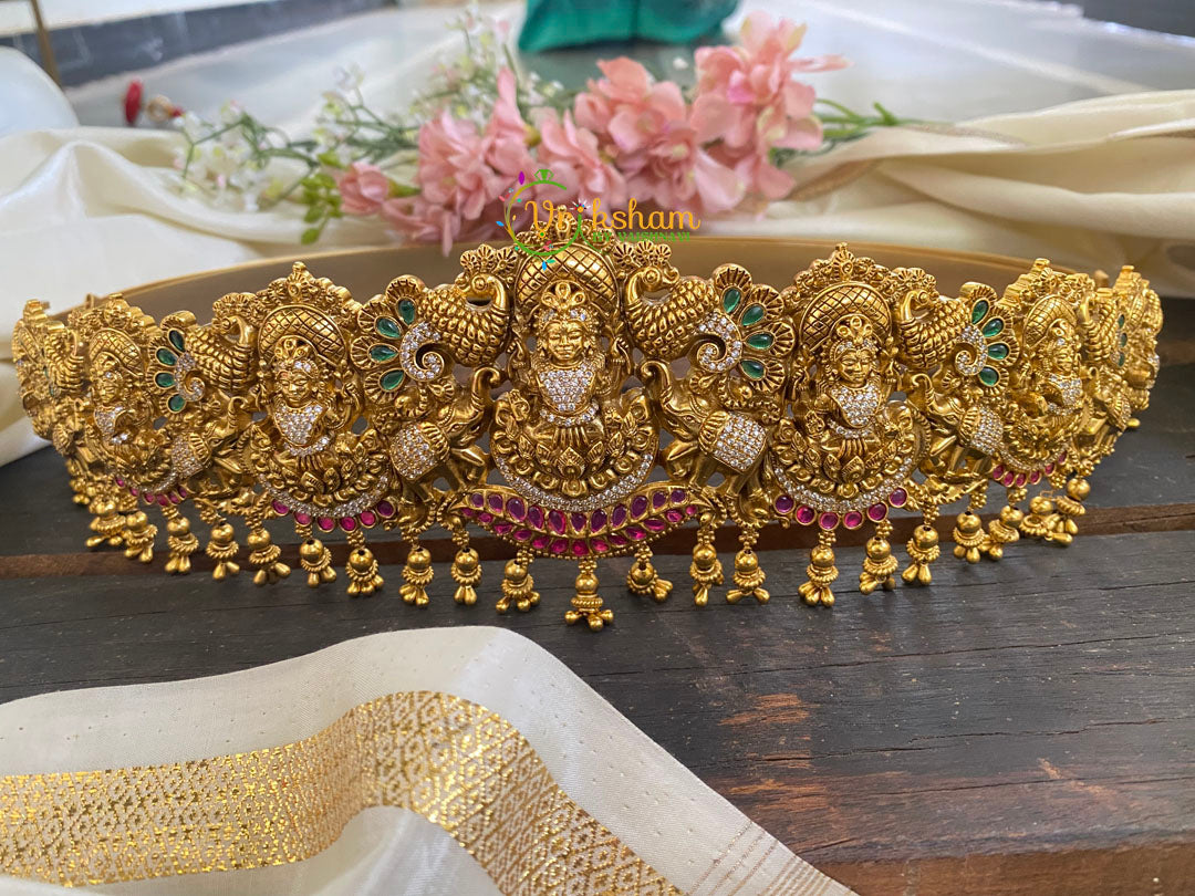 Premium AD Stone Lakshmi Temple Hipbelt- with ad stone studded lakshmi idols, elephants, peacocks pattern bridal temple hipblet.