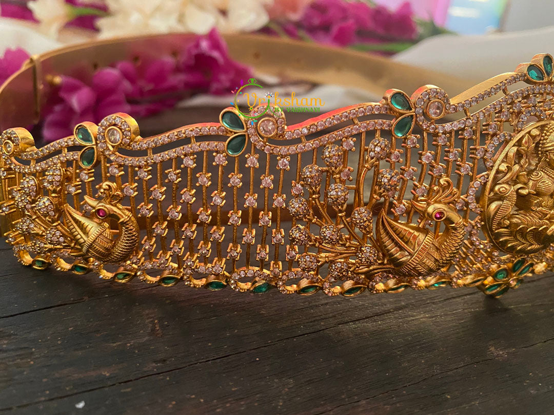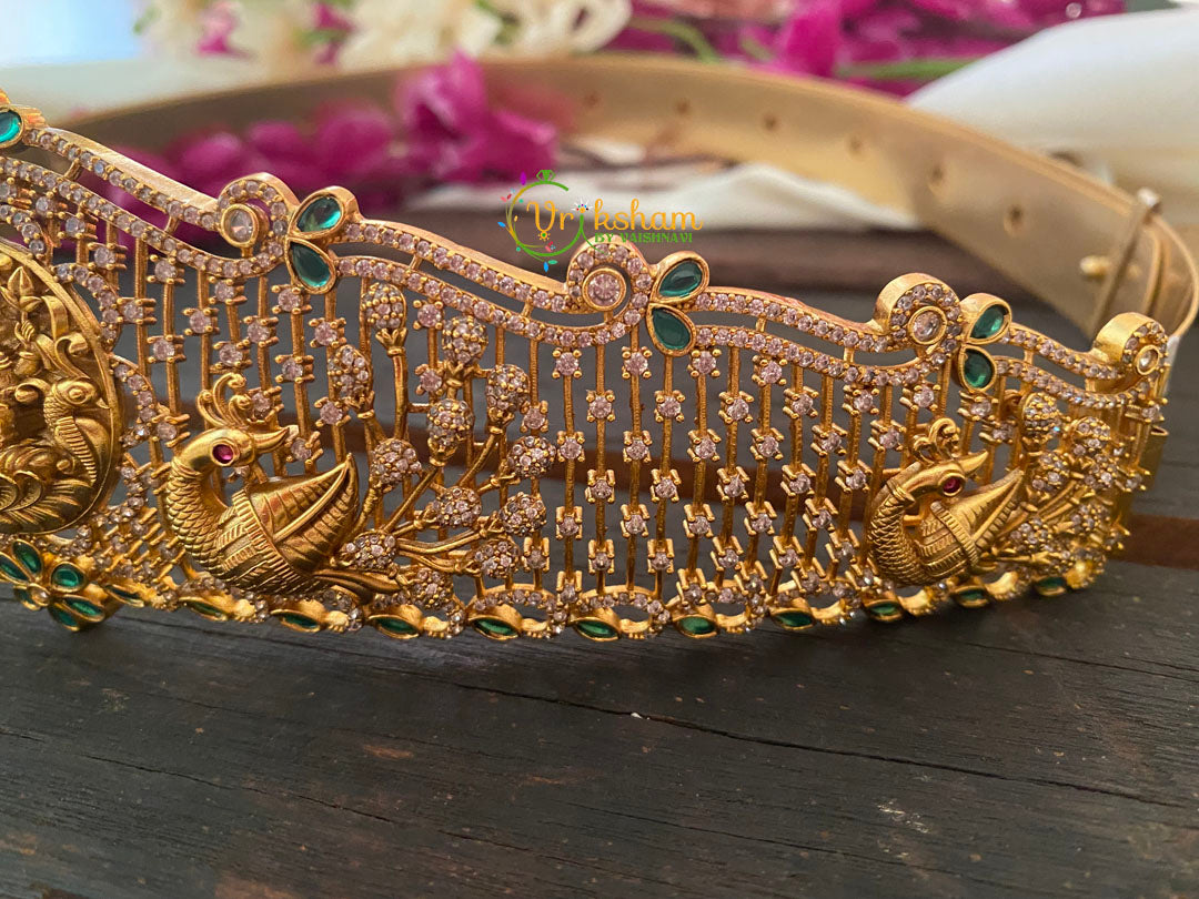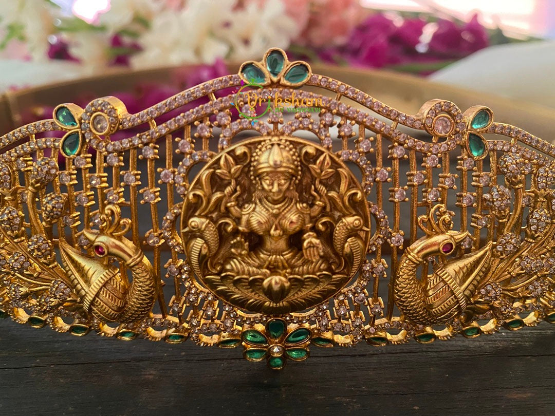 AD Stone Lakshmi Temple Hipbelt- with ad stone studded lakshmi idol, peacocks and fiigree pattern bridal temple hipblet.