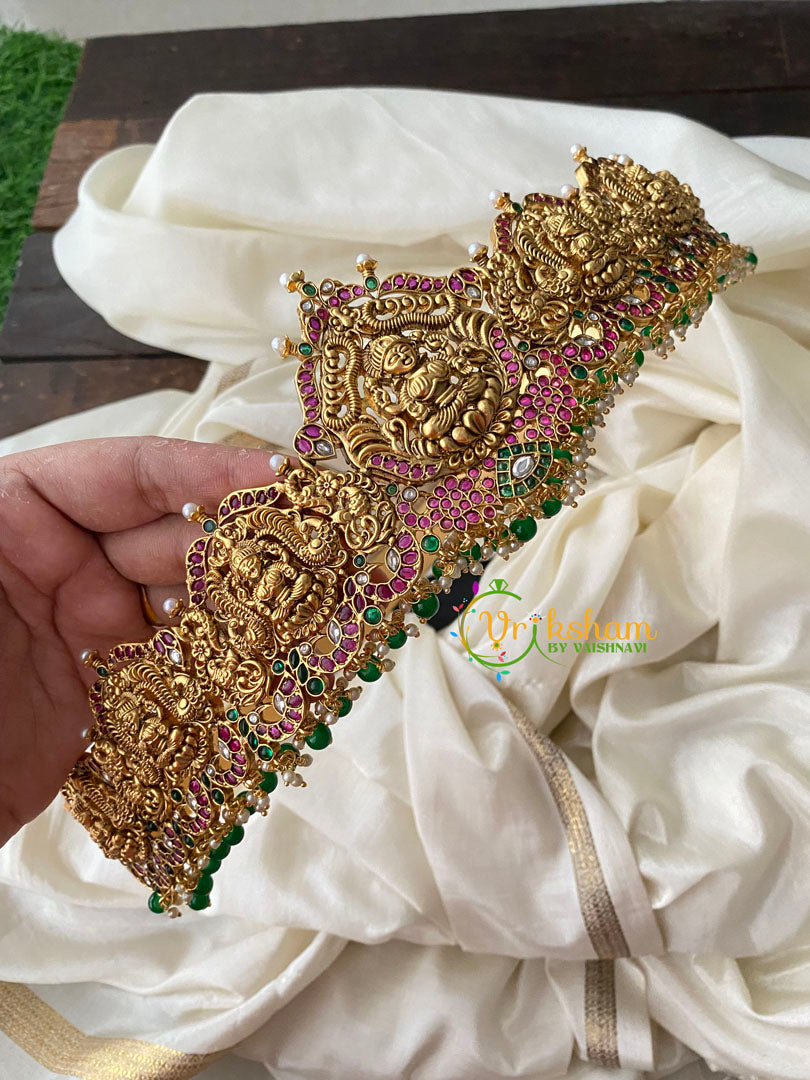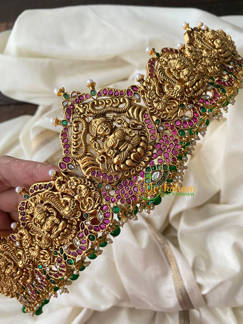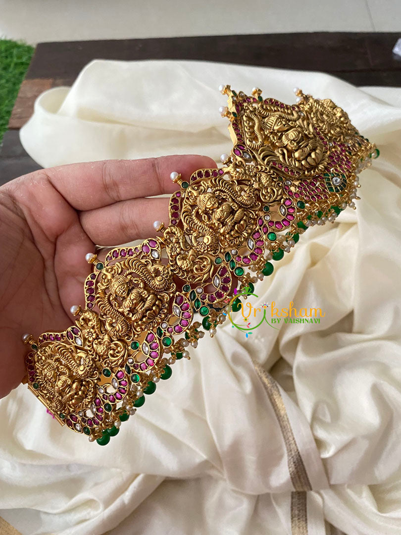 Premium AD Stone Lakshmi Temple Hipbelt-Green Bead Finish with ad stone studded lakshmi idols, and peacocks pattern bridal temple hipblet.