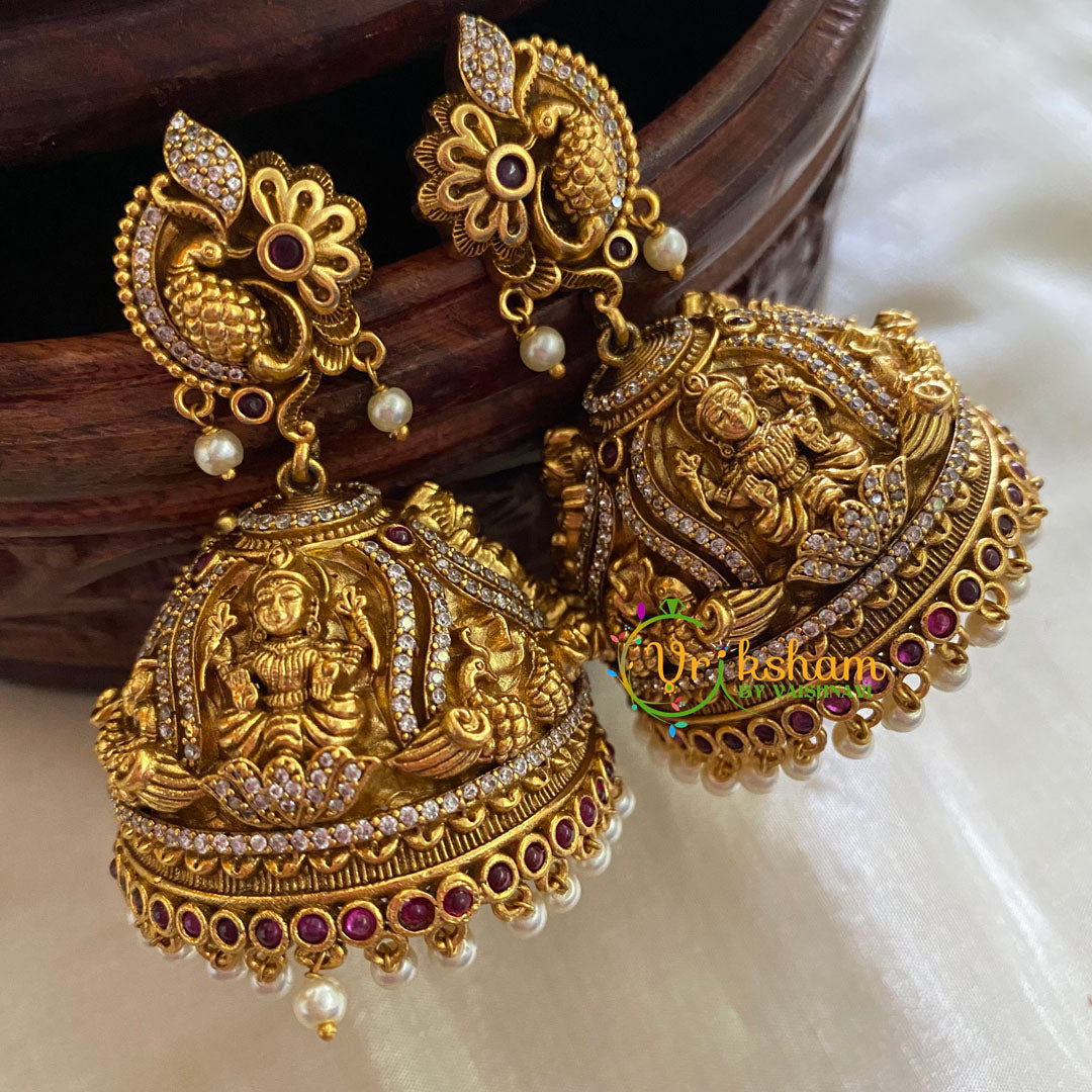 Premium AD Stone Lakshmi Temple Jhumkas-Peacock-Red- Peacock studs followed by AD stone studded lakshmi jhumkas.