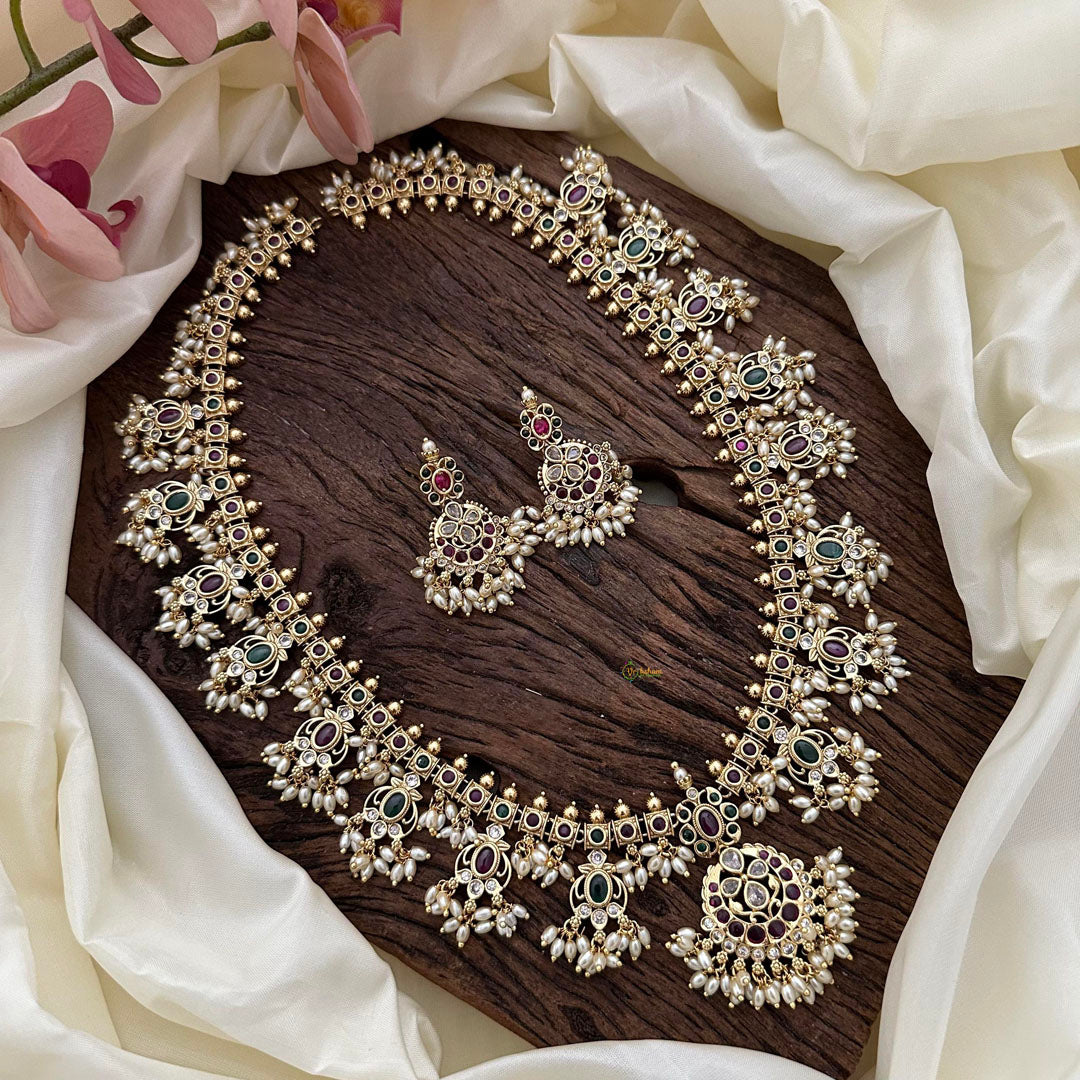 Embrace luxury with our exquisite AD Stone Long Guttapusalu-Rice Pearl necklace. Designed with intricate red, green, and white stones, this piece evokes sophistication and exclusivity. Elevate any outfit with the timeless elegance of this necklace.