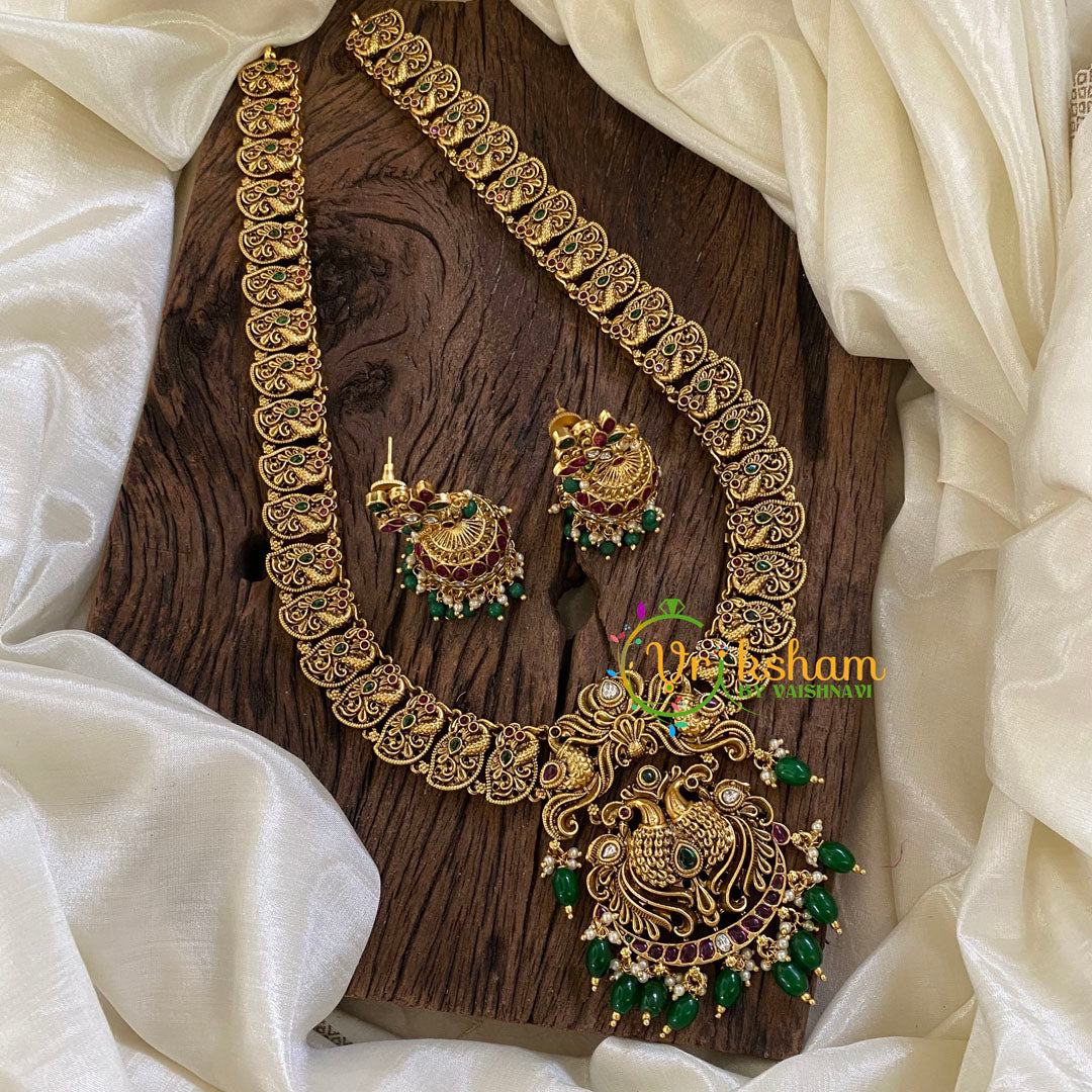 Antique Gold Look Alike AD Stone Long Neckpiece-Peacock -Intricately designed neckpiece/haram with ad stone pendant; comes with matching ear earrings.