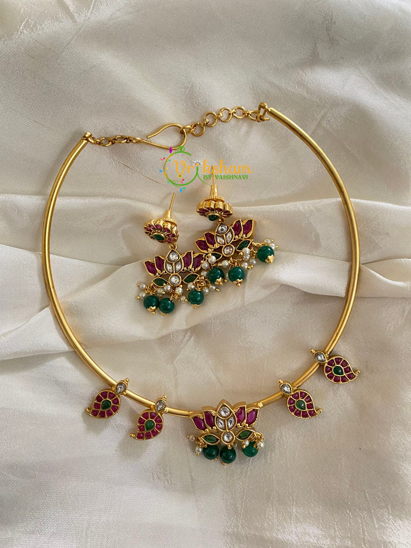 Premium AD Stone Lotus Hasli Choker-Green Bead and Pearl finish - premium quality AD Stone studded pendant hasli short neckpiece, comes with matching earrings.