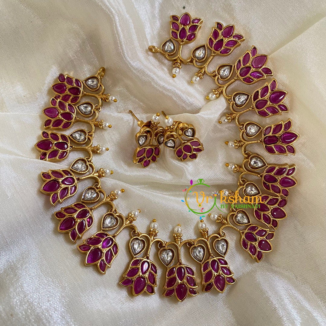 Premium AD Stone Lotus Short Neckpiece-Red ad stone AD stone studded Short Neckpiece and earring. Pearl and ghungroo Finish.