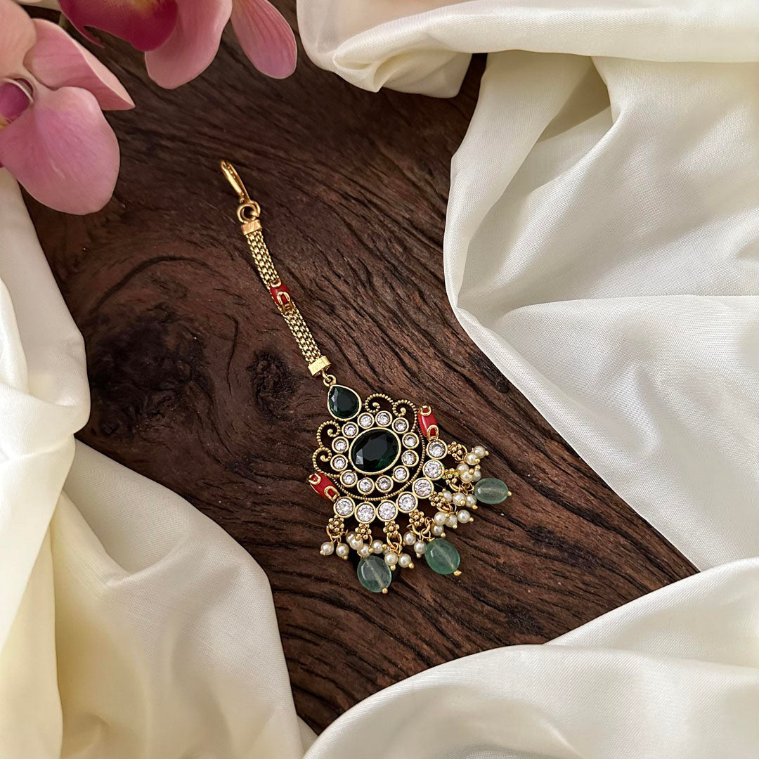 Elevate your look with our Ad Stone Maang Tikka. Designed with vibrant coral and aqua green beads, and adorned with lustrous pearls, this elegant and exclusive piece is sure to make a statement. Perfect for any special occasion, this Maang Tikka will add a touch of luxury to your ensemble.
