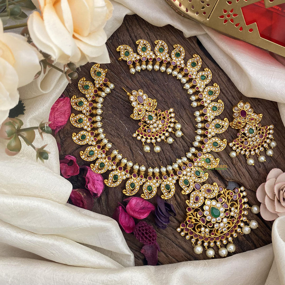Premium AD Stone Maanga Neckpiece -White Green Red ad stone studded – Premium quality short neckpiece, comes with similar matching ear hangings.