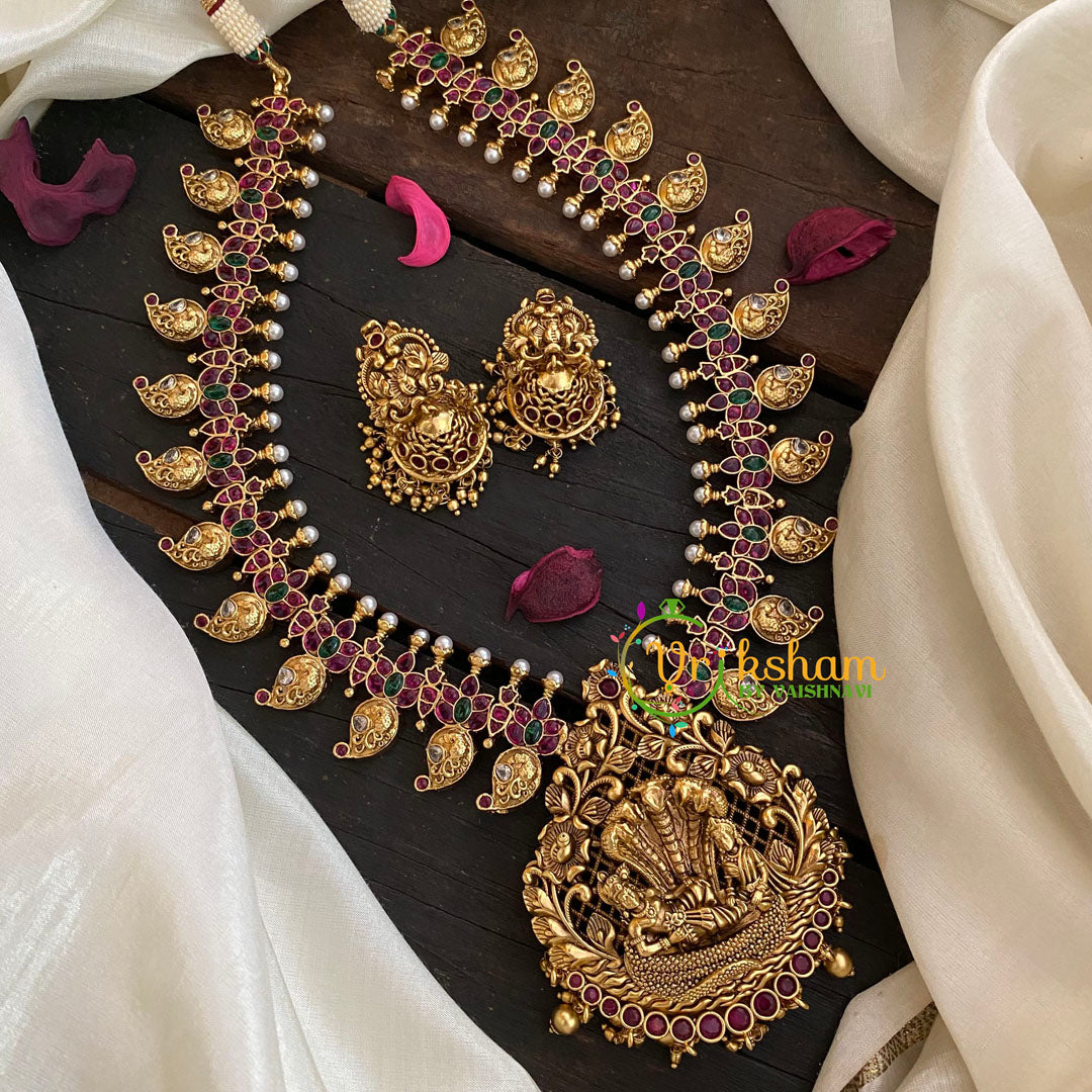 Exquisite AD Stone Maanga Neckpiece with Shri Vishnu Pendant , with predominantly red stone – comes with matching jhumkas.
